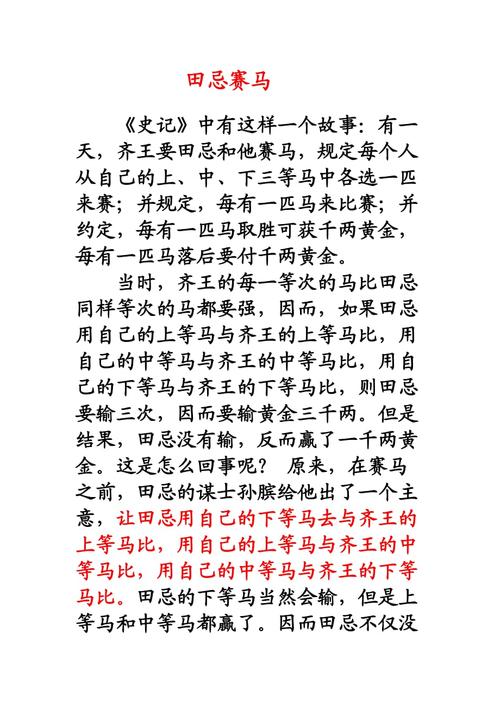 故事的情节大家都知道,田忌面对的对手实力比他强,但是他采用了“以慢制快,以稳胜急”的策略,最终在赛马中获得了胜利。